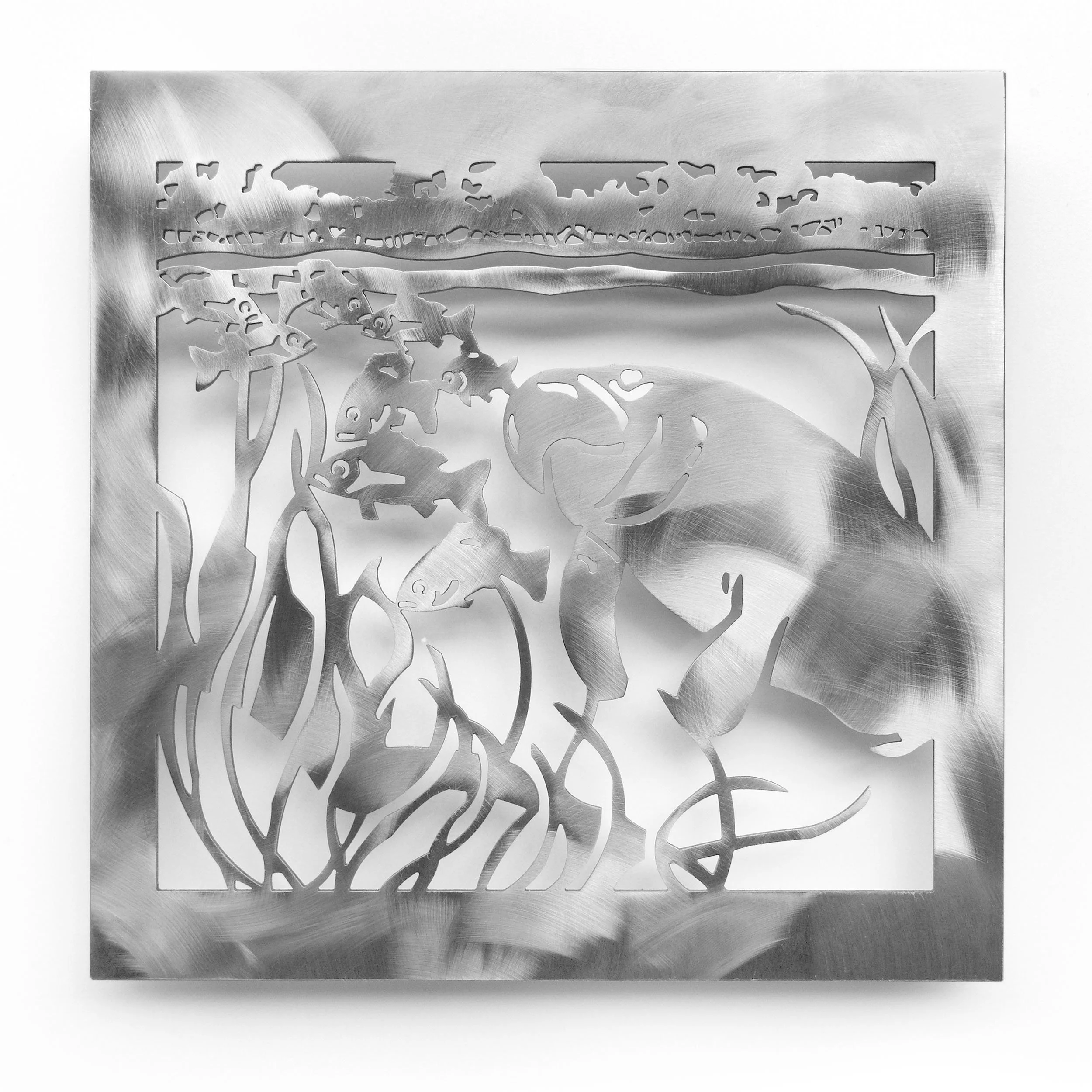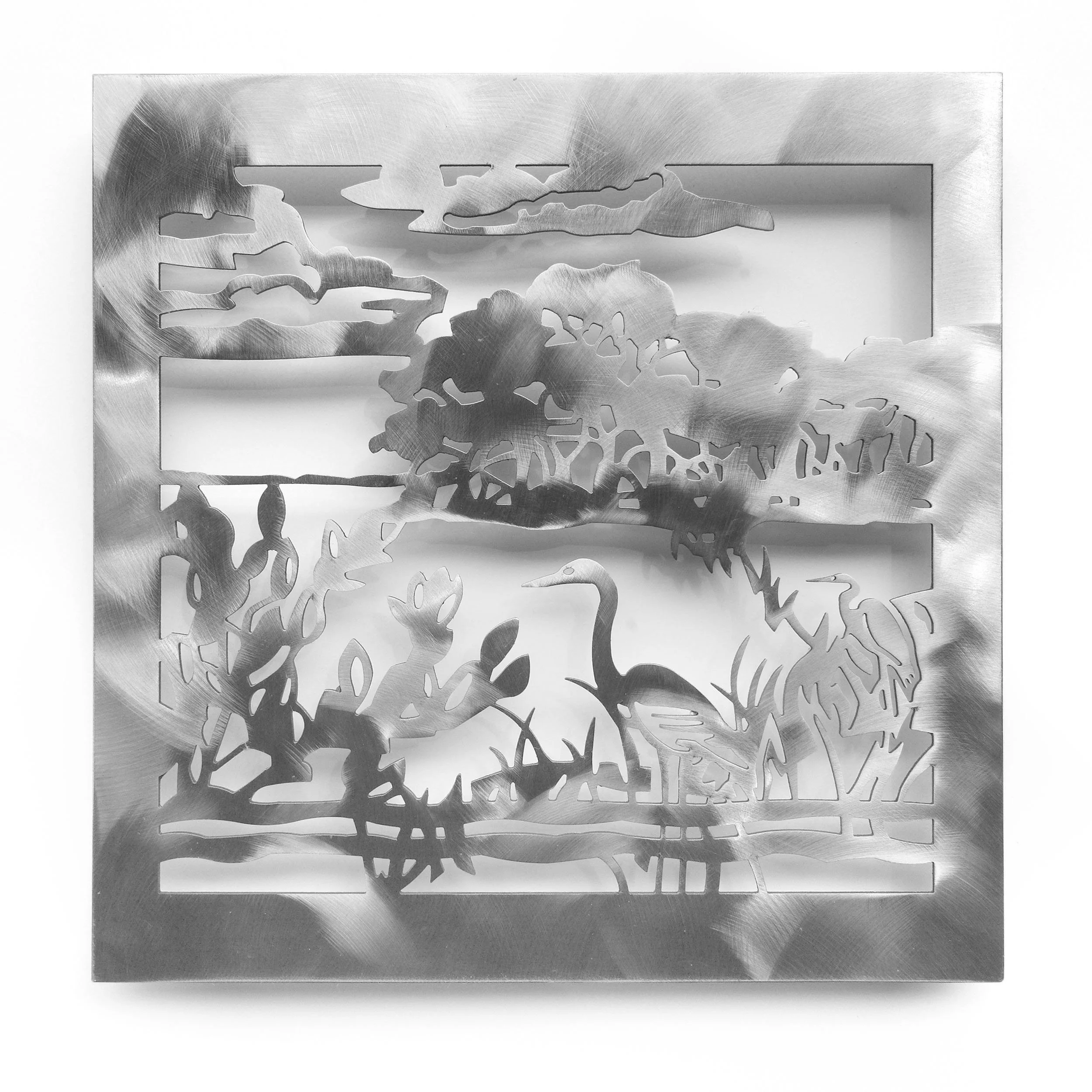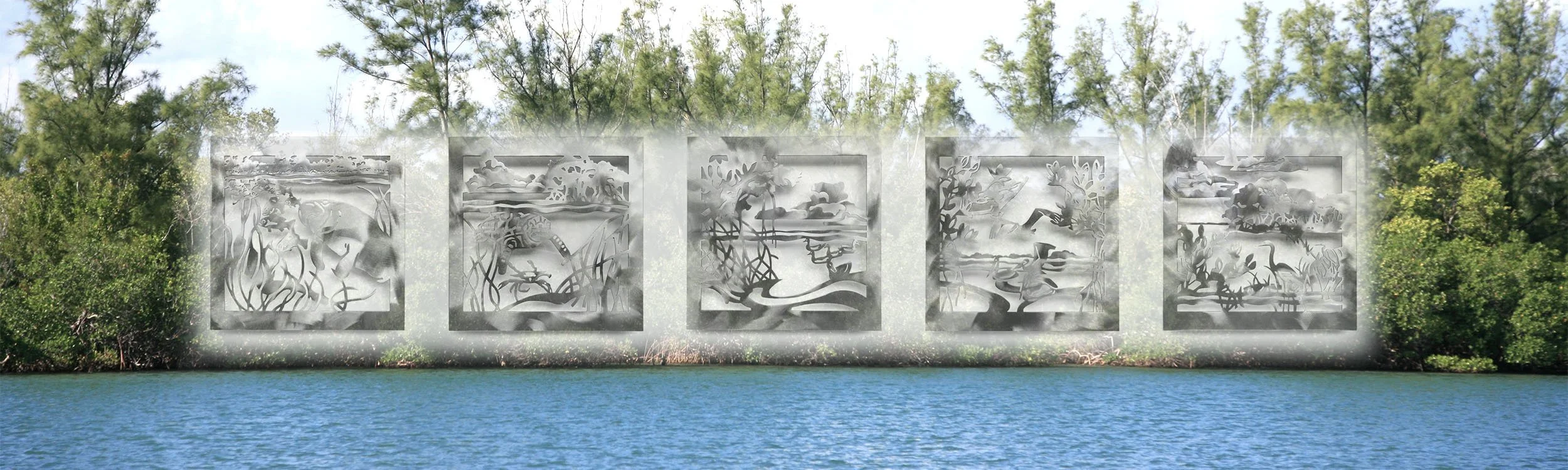 Concept model for Lagoon Passage layered over site photography of the Indian River Lagoon, evoking environmental memory and sculptural integration